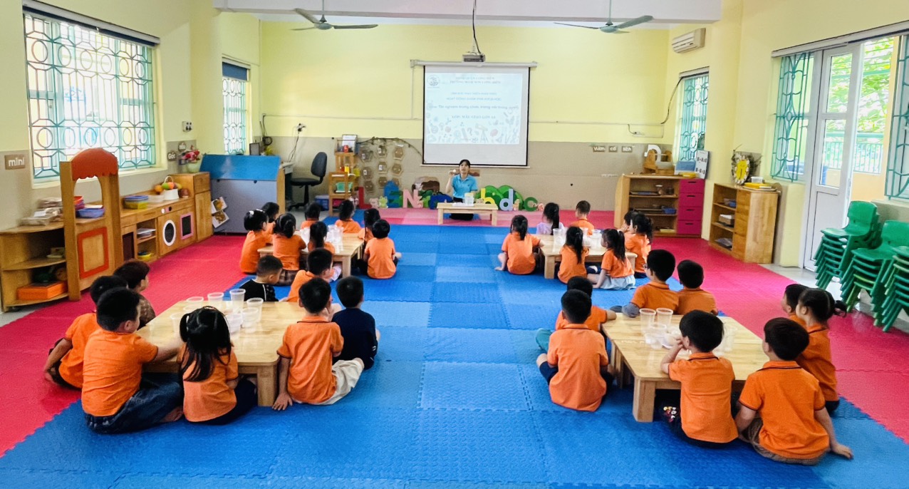 Sau đây là một số hình ảnh Các bé lớp mẫu giáo lớn A4 Trường mầm non Long Biên tham gia làm thí nghiệm “ Trứng chìm, trứng nổi”
