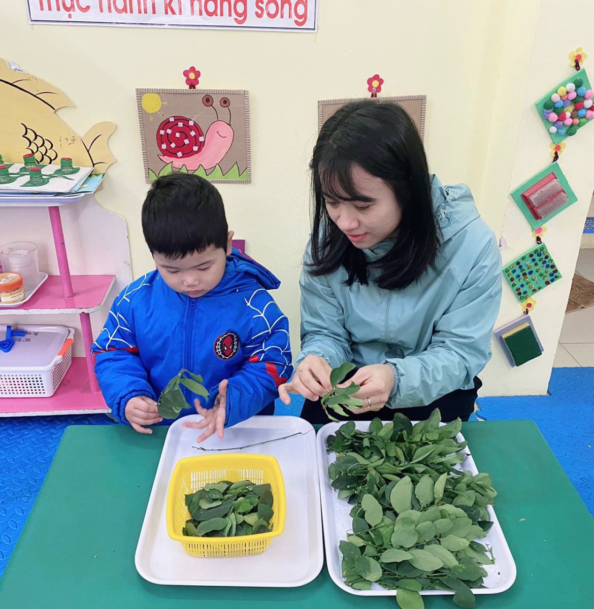Hôm nay các con lớp Nhà trẻ D1 đã được tìm hiểu về rau ngót cũng như cách nhặt rau.