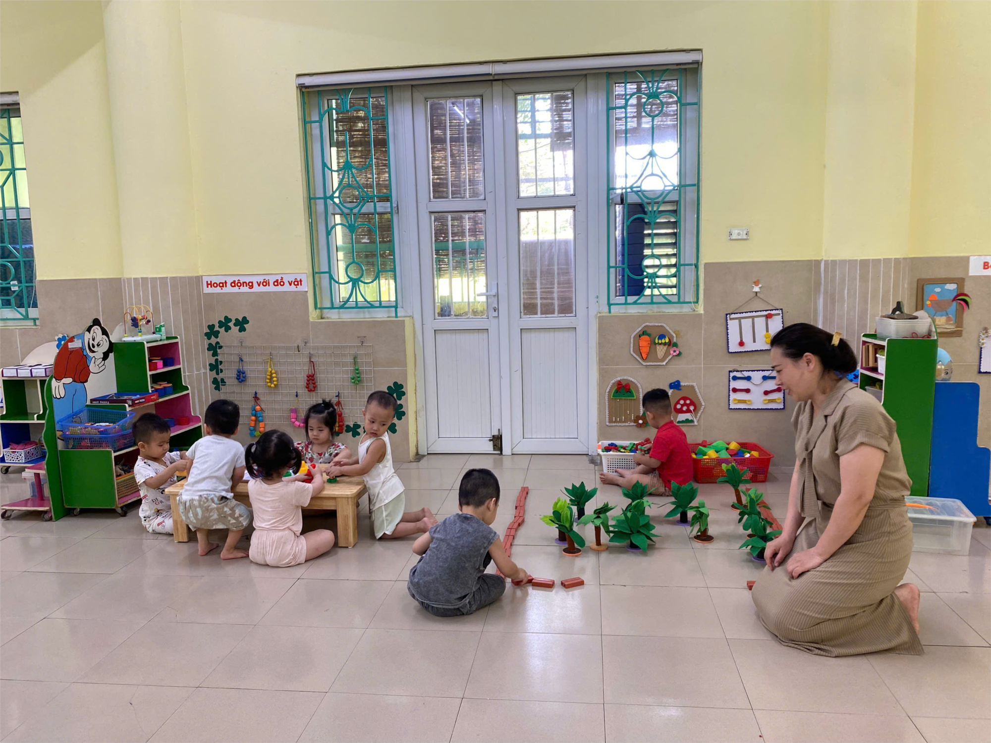 Khi nghe cô phổ biến thỏa thuận chơi thì tất cả các con đều phấn khởi và thích thú, lựa chọn cho mình góc chơi mà trẻ thích nhất. Ở mỗi góc trẻ đều được học những kỹ năng khác nhau như chăm sóc em búp bê ở góc “Bế em”, xếp chồng, vếp cạnh ở góc “Hoạt động với đồ vật”, phân biệt hình và màu của các đồ chơi ở góc “Bé chơi với hình và màu”…