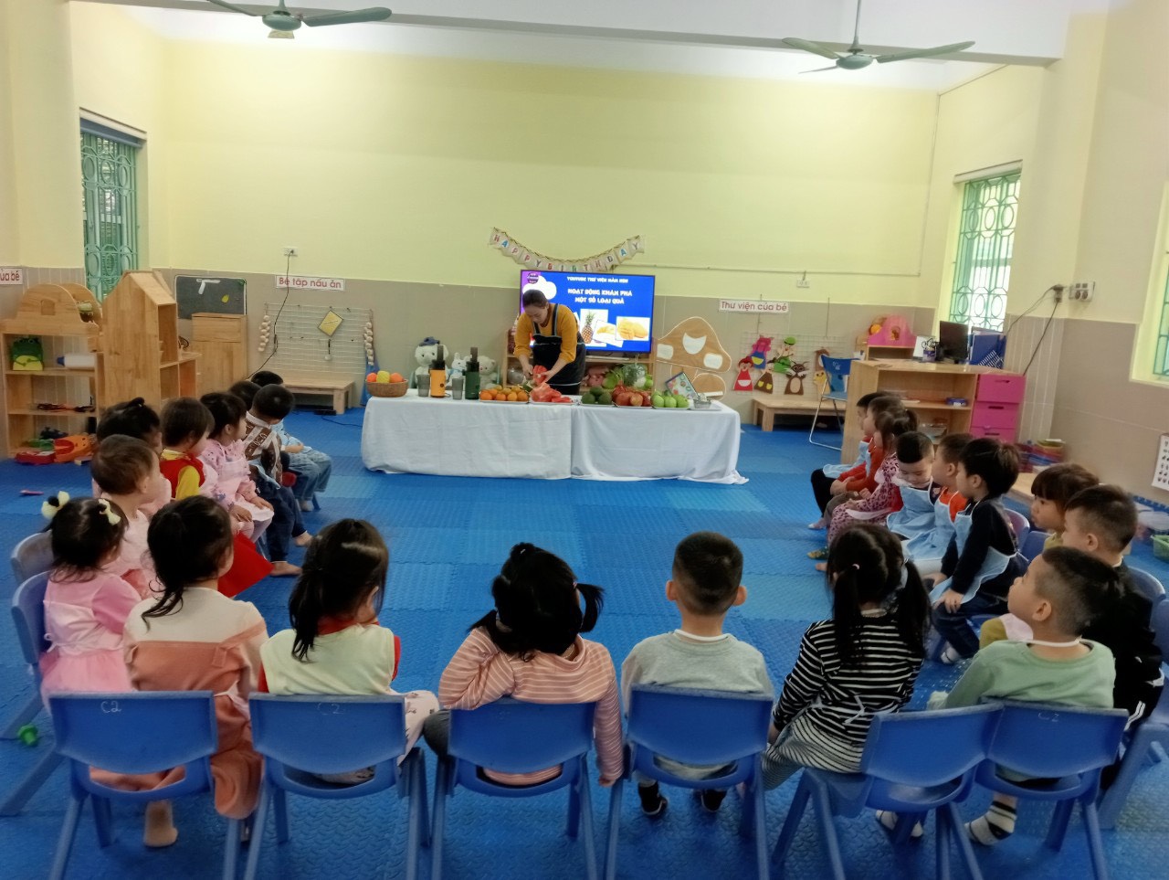 Hoa quả có cách chế biến khá đơn giản. Dưới sự chuẩn bị chu đáo và cách hướng dẫn của cô giáo, các bé đã tự tay làm cho mình những cốc nước ép vô cùng bổ dưỡng và đẹp mắt.