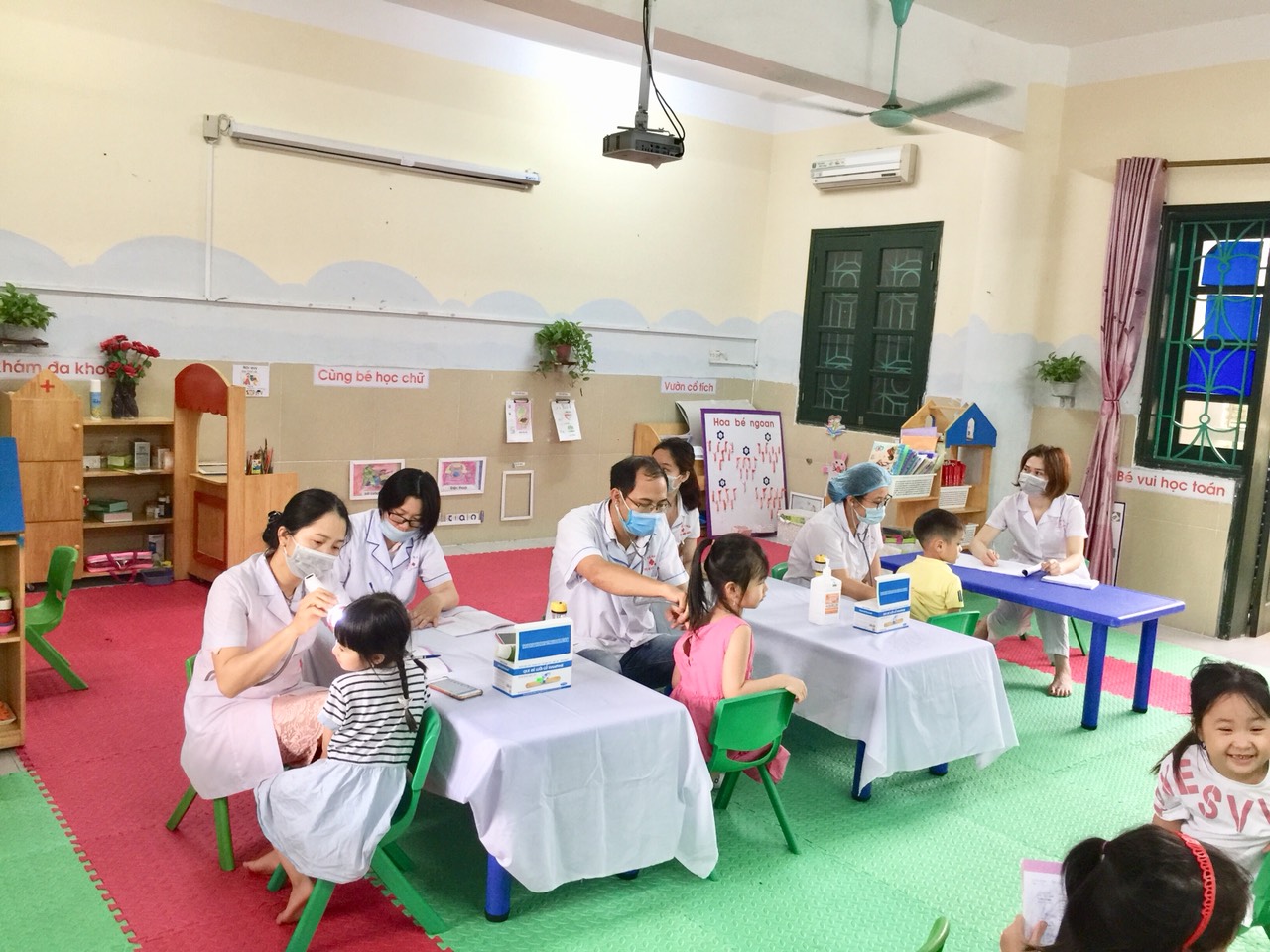 Tham gia vào buổi khám bệnh, trẻ được khám mắt, răng, miệng, hô hấp, cân nặng, chiều cao, .... Có sổ khám bệnh, hồ sơ quản lý, theo dõi tình hình sức khỏe học sinh cho các học sinh. Kết quả kiểm tra sức khoẻ của các em sẽ được cán bộ y tế của Trạm y tế phường ghi chép cụ thể trong sổ theo dõi sức khỏe và được cán bộ y tế nhà trường kết hợp với giáo viên các lớp thông báo đến phụ huynh, đặc biệt một số em mắc bệnh đã được thông báo đến từng cha mẹ hoặc người giám hộ của học sinh về tình hình sức khỏe học sinh; có kế hoạch chăm sóc và điều trị cho học sinh có vấn đề sức khỏe.