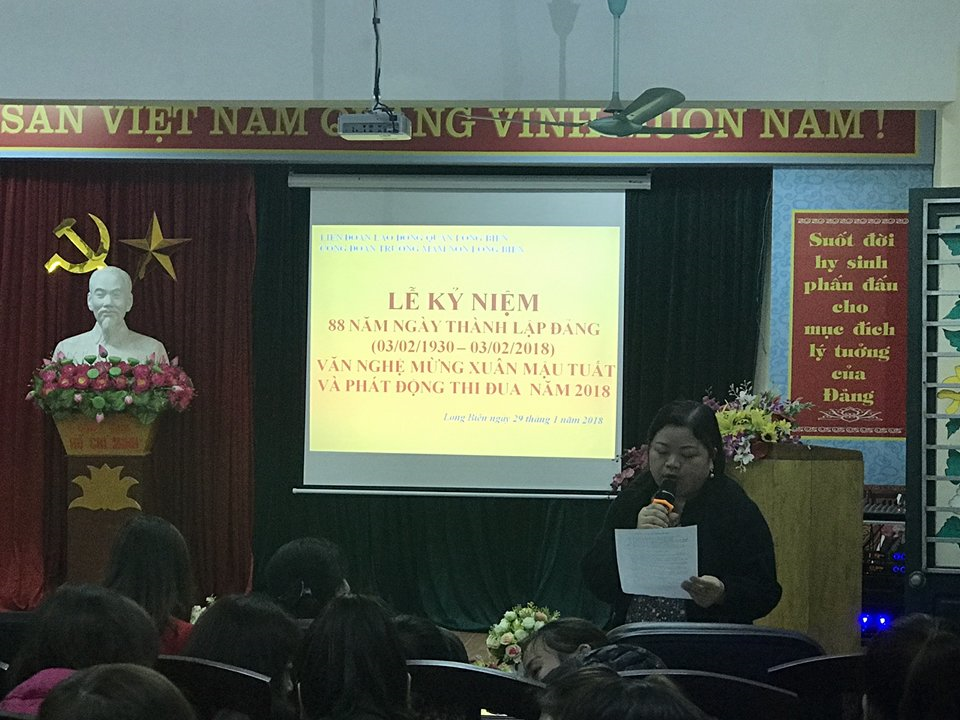 Chào mừng kỷ niệm 88 năm ngày thành lập Đảng cộng sản việt Nam trong không khí vui tươi, phấn khởi chào đón năm mới. Tập thể cán bộ - giáo viên – nhân viên trường mầm non Long Biên đang ra sức thi đua lập thành tích chào mừng các ngày lễ lớn của đất nước của Quận Long Biên và ngành giáo dục. Tích cực hoàn thành các chỉ tiêu – kế hoạch năm 2018
